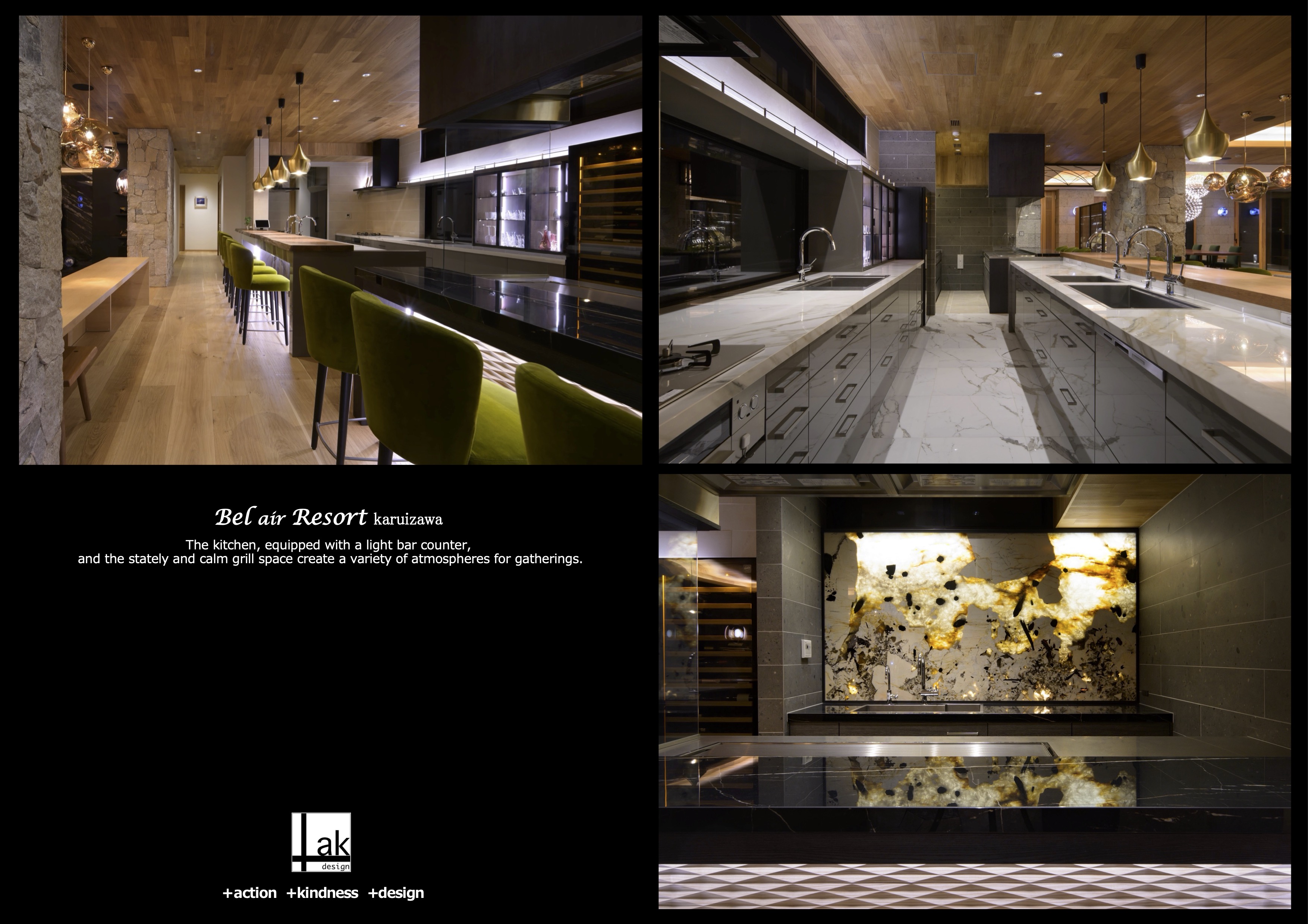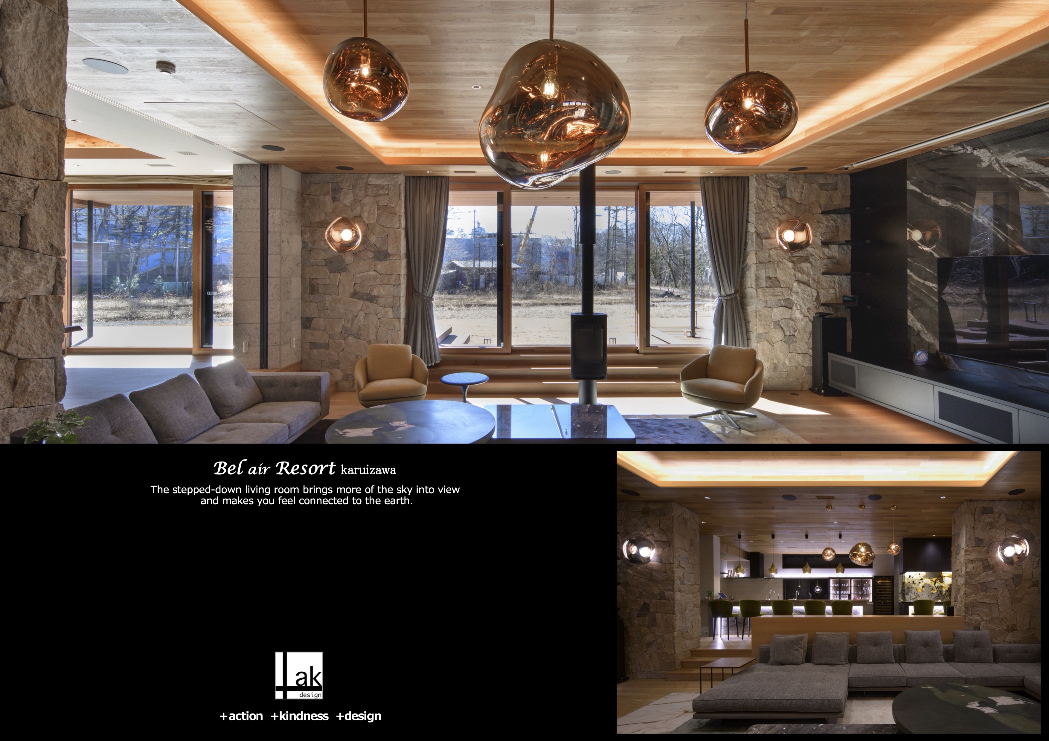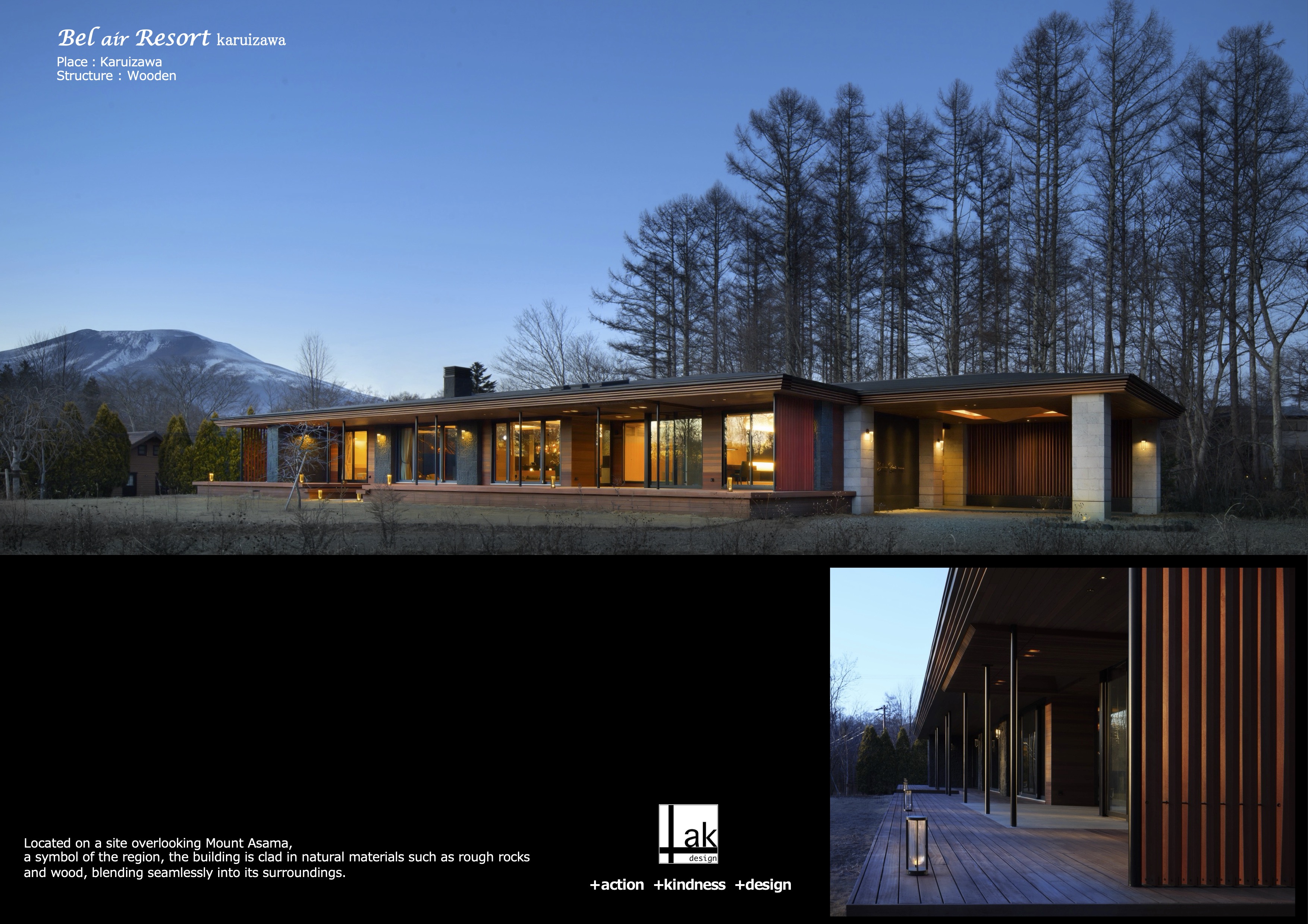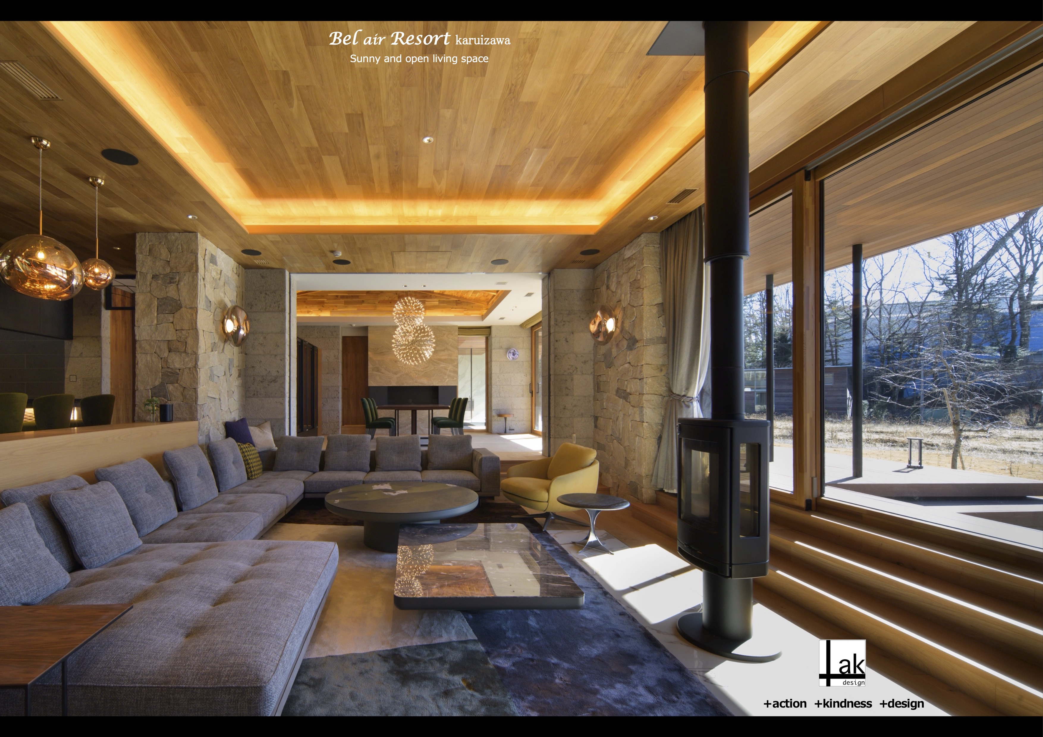 浅間山を望む敷地に、荒々しい岩石と木材の自然素材を纏って佇み、