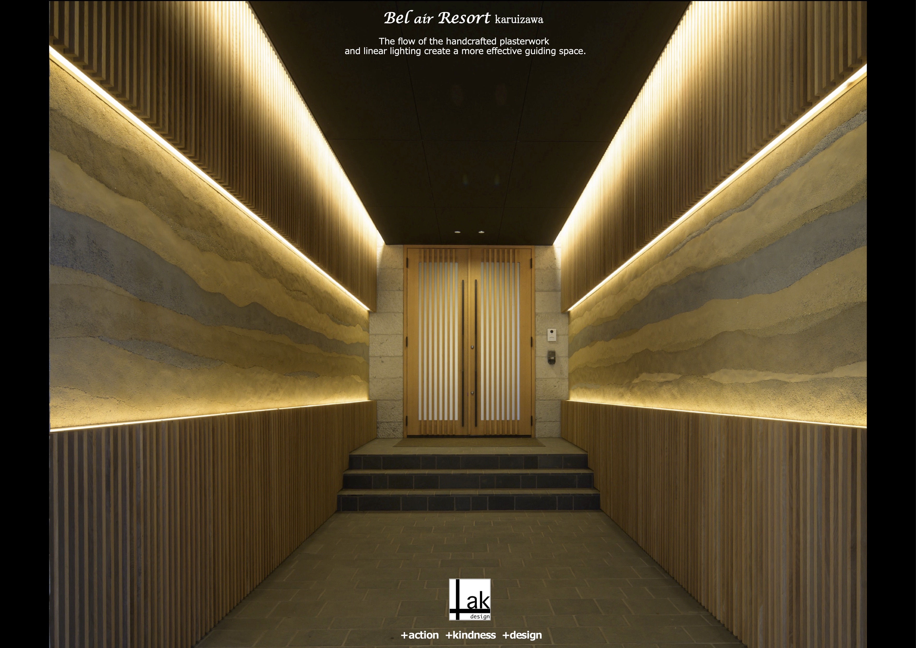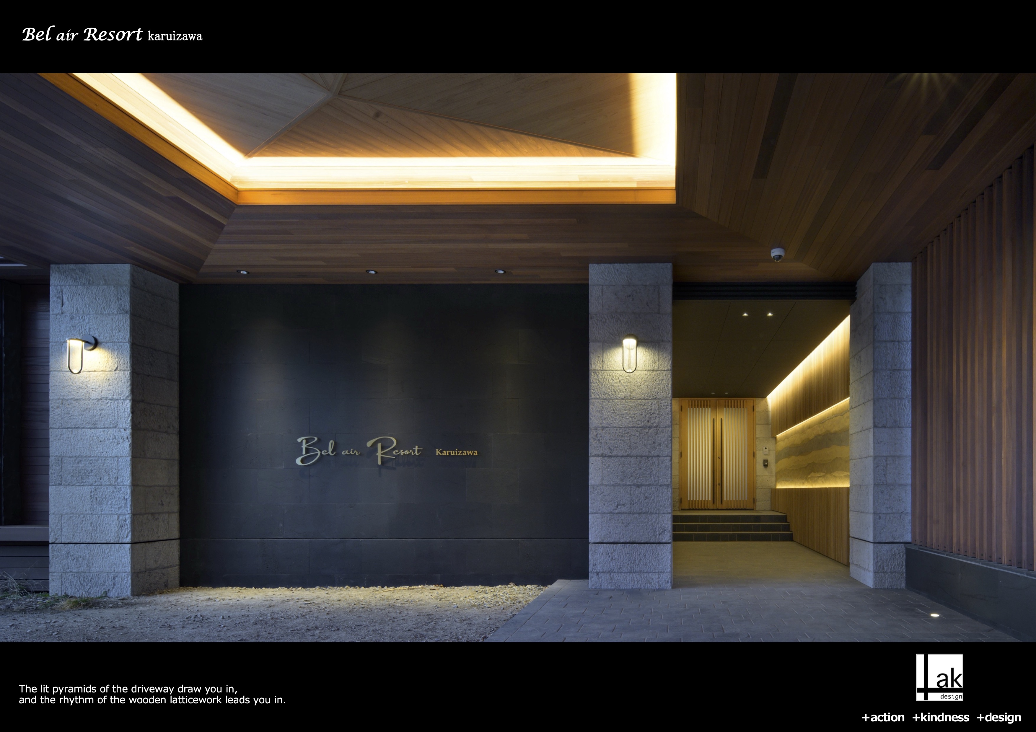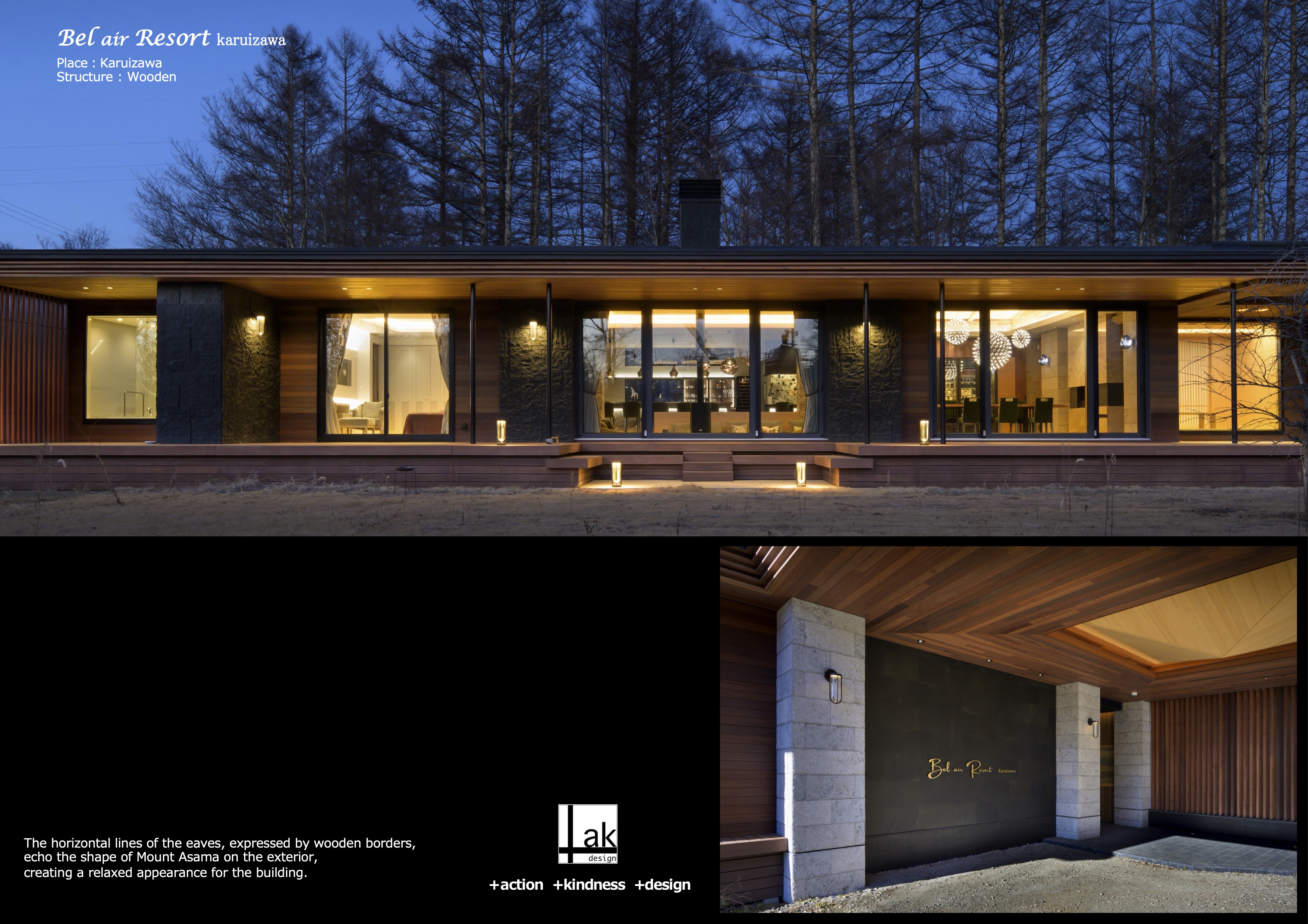 自然の山の造形に対し、木製ボーダーで表現された軒先の水平ラインが呼応することで、